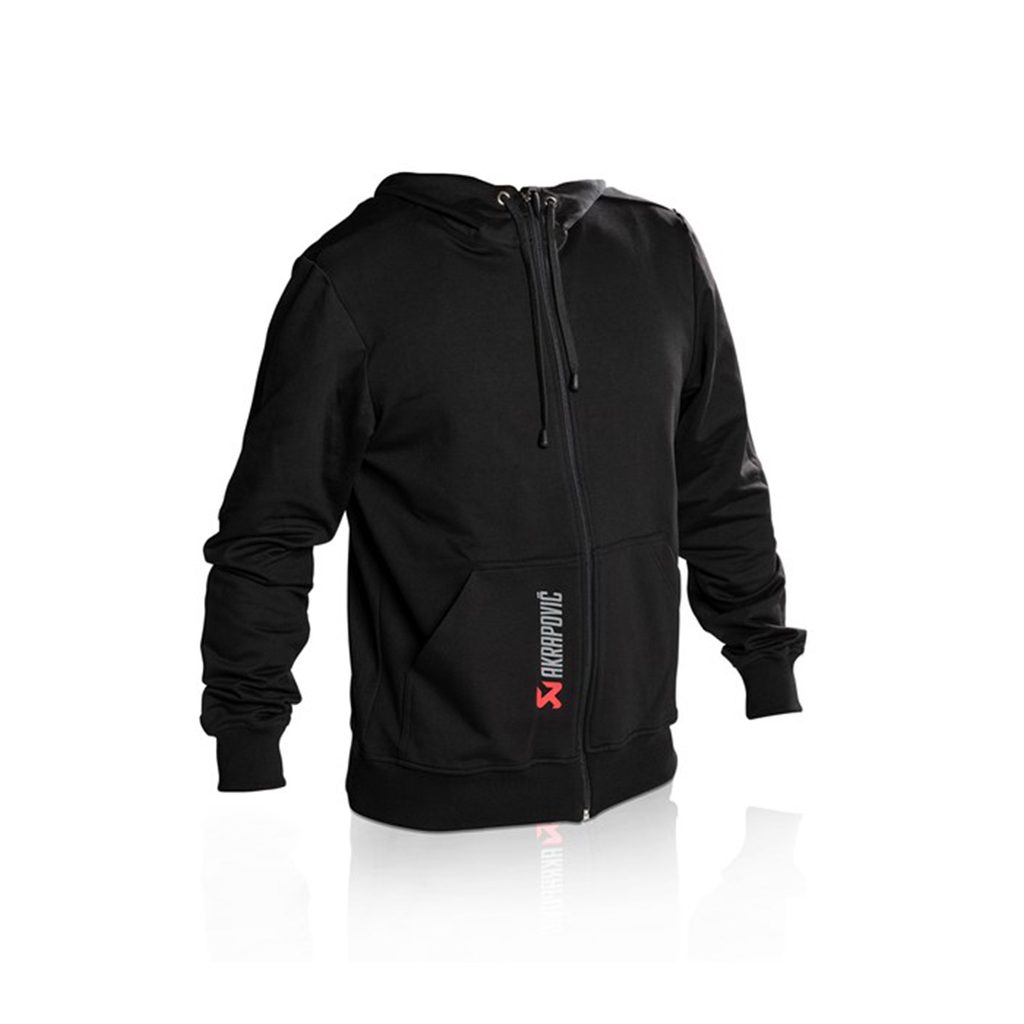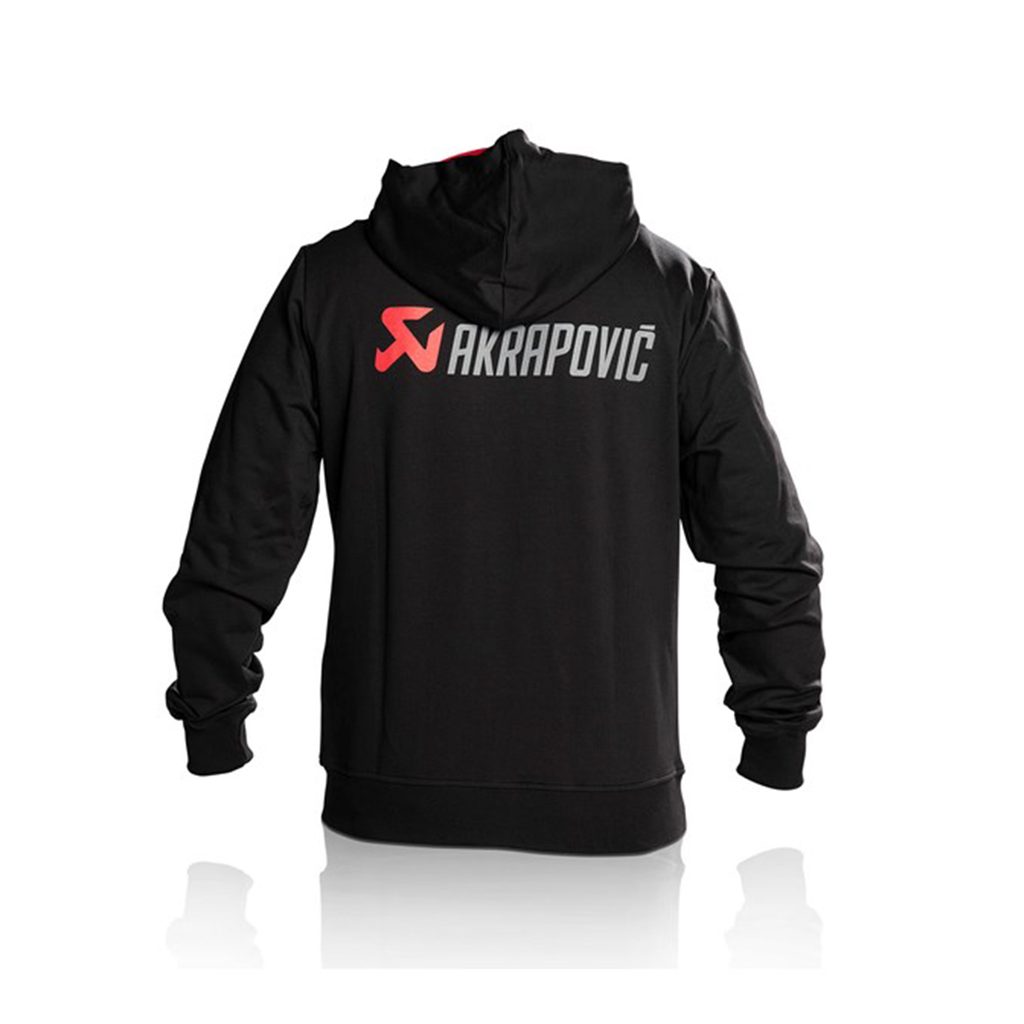 Černá mikina s červenou kapucí (uvnitř). S logem Akrapovic na přední kapse a velkým logem na zadní straně. Vyrobeno ve Slovinsku.