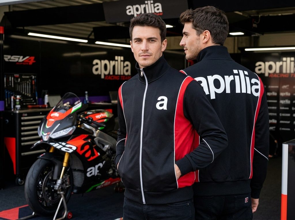 Sportovní bunda Aprilia Track Active v ikonickém panelovém designu kombinuje retro závodní styl s moderními materiály, elastickými náplety a vysoce kvalitním brandingem na zádech i rukávu.