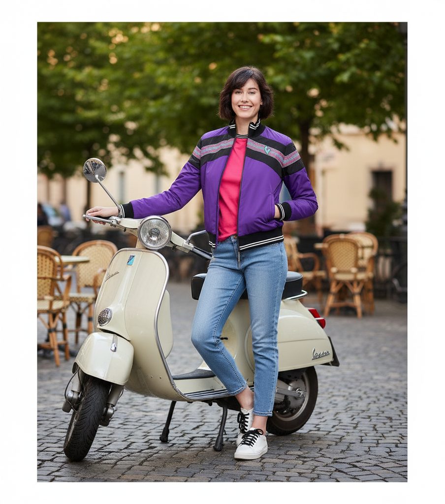 Nádherně fialová bunda Vespa Bomber s reflexními detaily pro lepší viditelnost. Bunda je voděodolná a větruvzdorná.