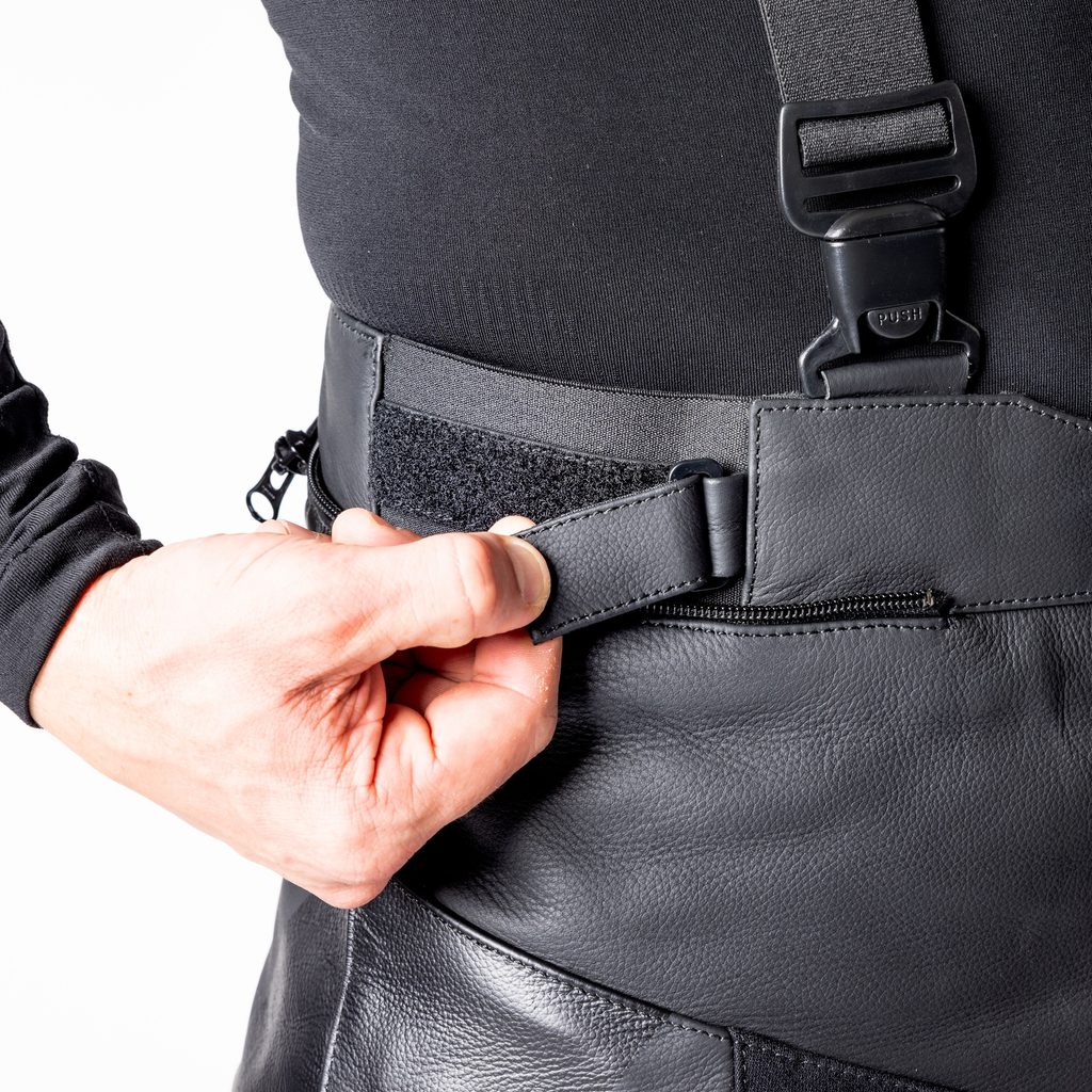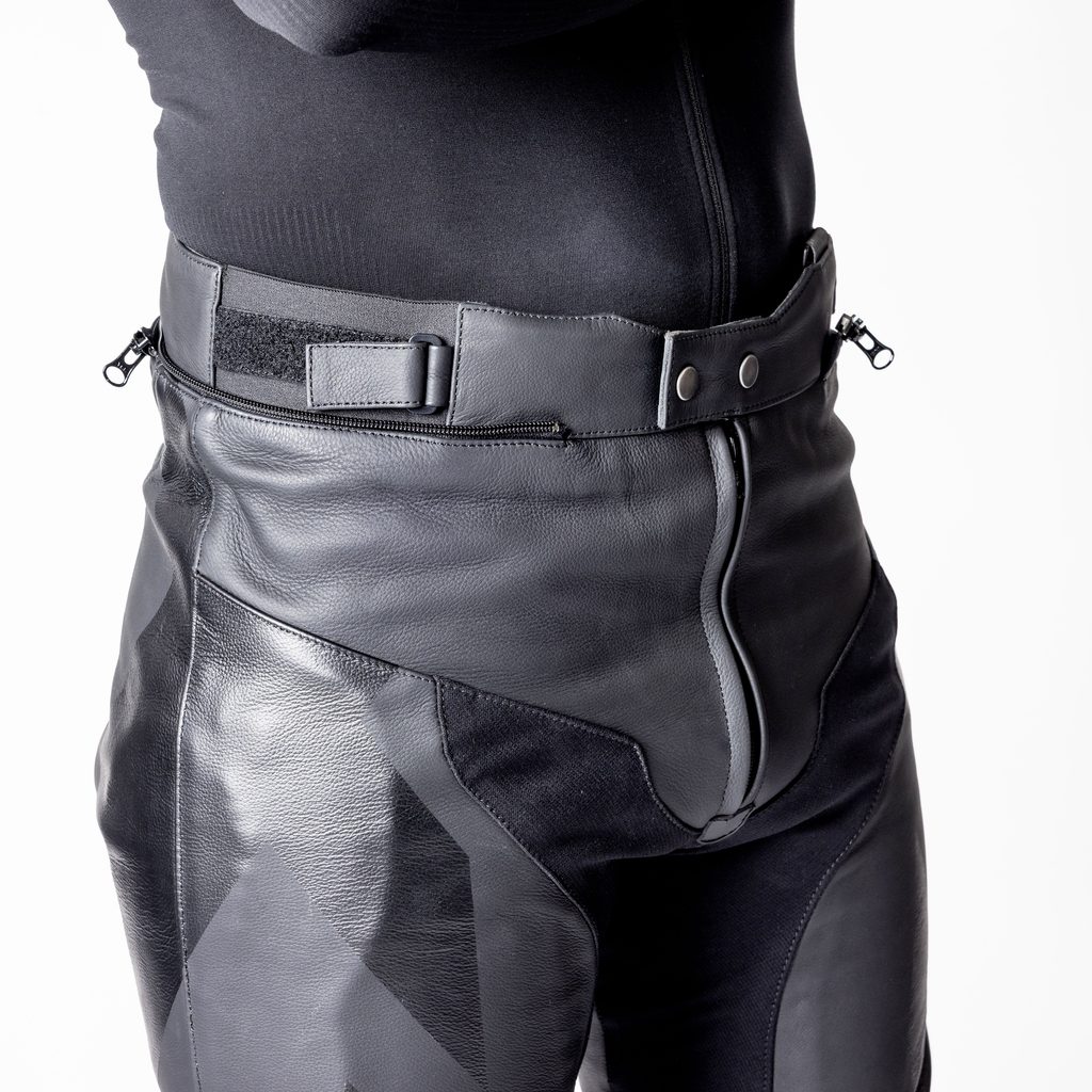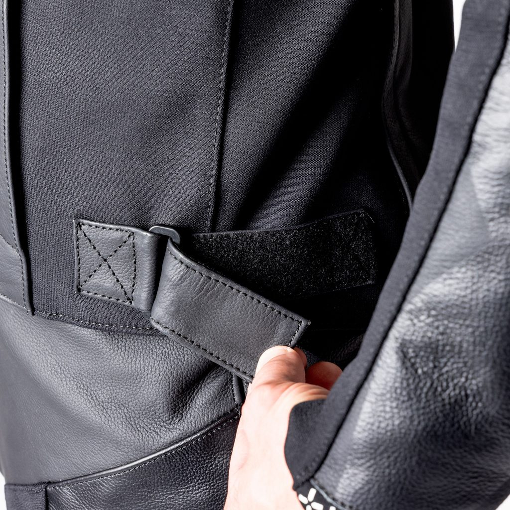 - Kožené akordeonové panely na ramenou, přes kolena a na hýždích