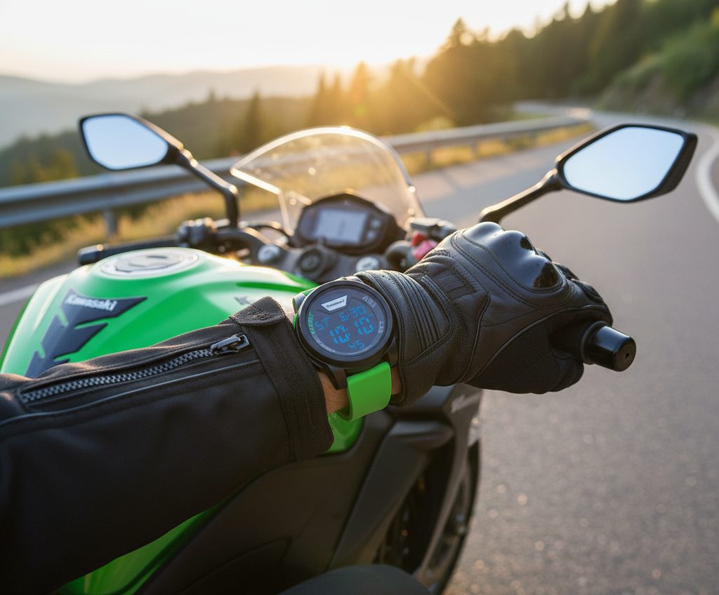 Designové hodinky Kawasaki se zeleným silikonovým páskem. Hodinky jsou vybaveny funkcí alarmu, stopek, dvou časových pásem a jsou vodotěsné do 5ATM.