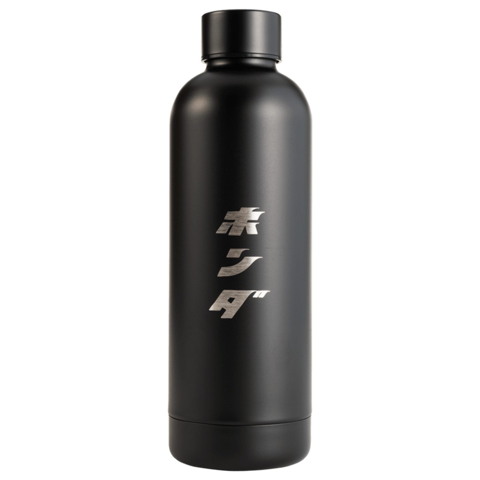 Elegantní černá termoska s logem Honda v japonském písmu a ikonickým emblémem křídla na víčku.