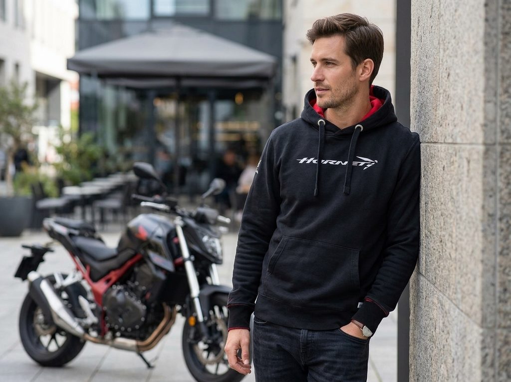 Exkluzivní černá mikina Honda Hornet Tribute s vintage efektem a reflexním logem kombinuje agresivní design s kontrastními červenými detaily pro všechny fanoušky legendárních strojů Hornet.