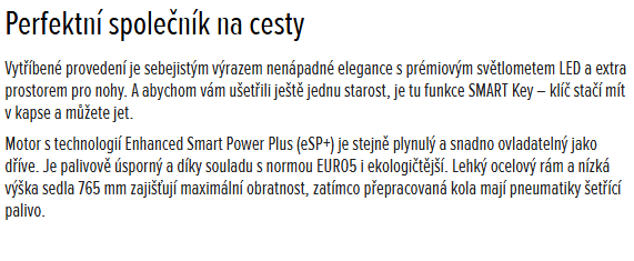 Je stále kompaktní, dá se snadno zaparkovat a prokličkuje hustým provozem, a navíc je teď ještě stylovější, s větším prostorem pro nohy a ostrými světlomety LED, které Vám posvítí na cestu. Úložný prostor pod sedadlem má objem 18,5l - pojme celoobličejovou helmu a ještě něco navíc. Odkládací schránka s vestavěnou zásuvkou USB-C je určena pro Vaše mobilní zařízení.
