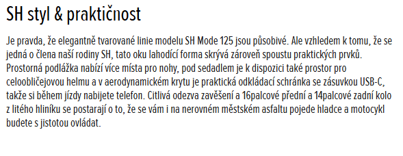 SH Mode 125, vycházející z velmi oblíbeného modelu SH125i, nabízí kompaktní rozměry, chytrou kapotáž a nízké provozní náklady