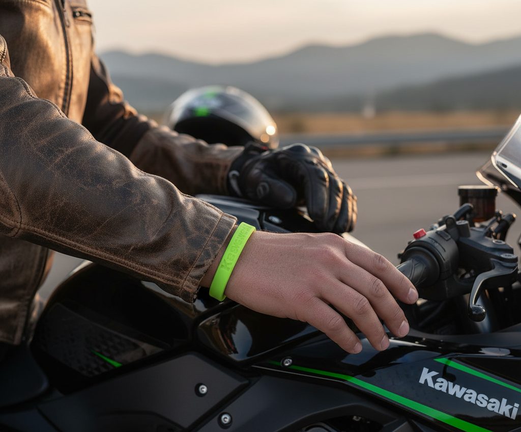 Náramek na zápěstí vyrobený ze zeleného silikonu s logem Kawasaki.