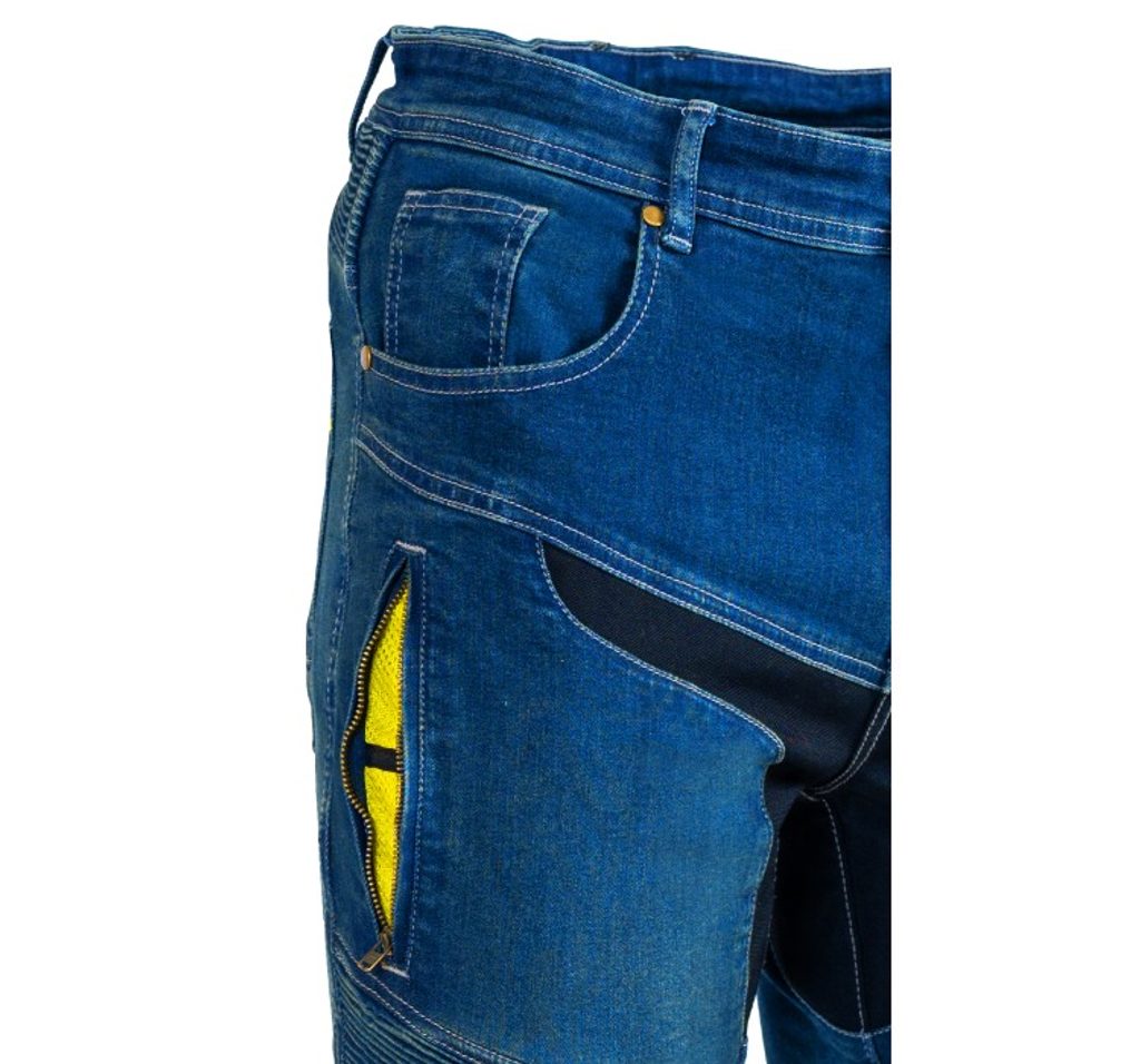 - materiál Dyneema v kombinaci s materiálem Denim tvoří bezkonkurenční vlastnosti motocyklových kalhot