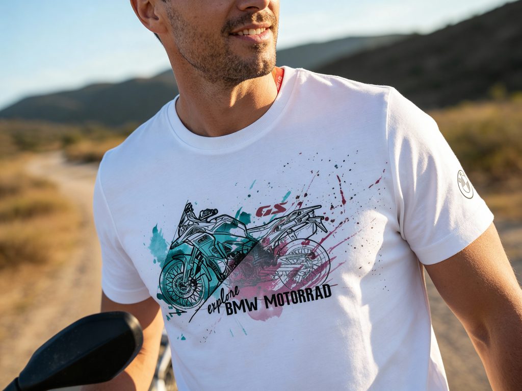 Tričko F850 GS vyjadřuje touhu po výzvách na vyjetých kolejích i mimo ně. Potisk na přední straně znázorňuje ikonickou siluetu modelu GS a stylizuje terénní a cestovní vlastnosti motocyklu.