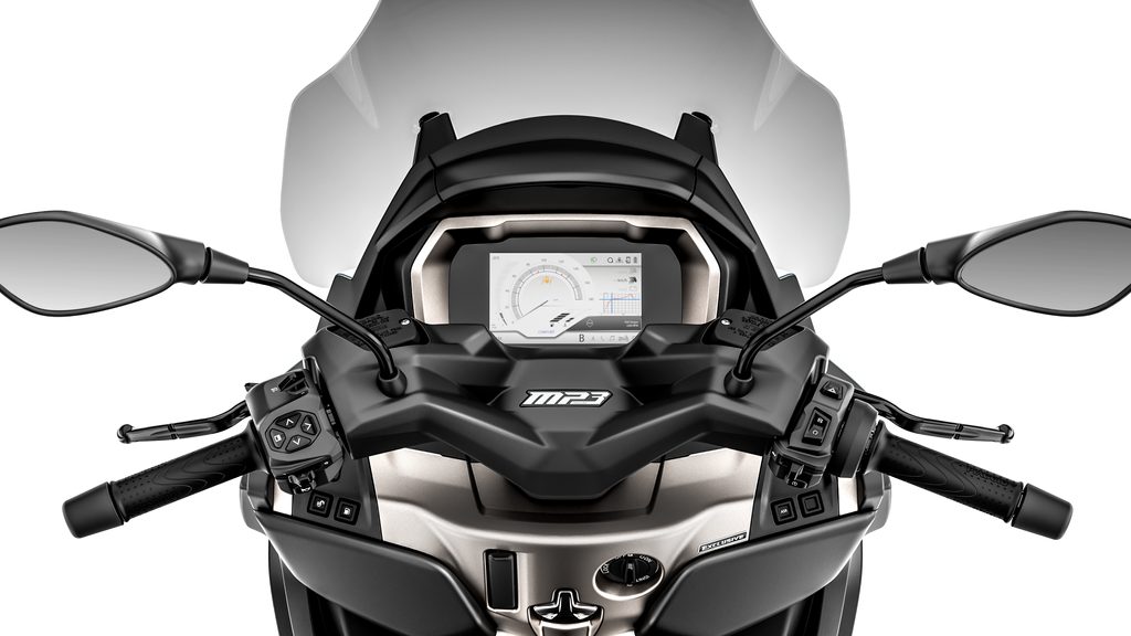 Pýchou modelu Piaggio MP3 530 Exclusive je jeho působivá technologická výbava, která překypuje funkcemi, jako je 7“ TFT displej s konektivitou Piaggio MIA, tempomat a zpětný chod se zadní kamerou pro snadnější parkování.