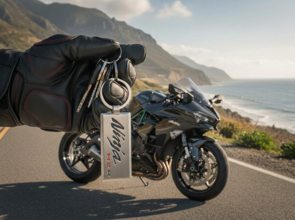 Klíčenka z kartáčovaného kovu s přelomovým logem Kawasaki Ninja H2R.