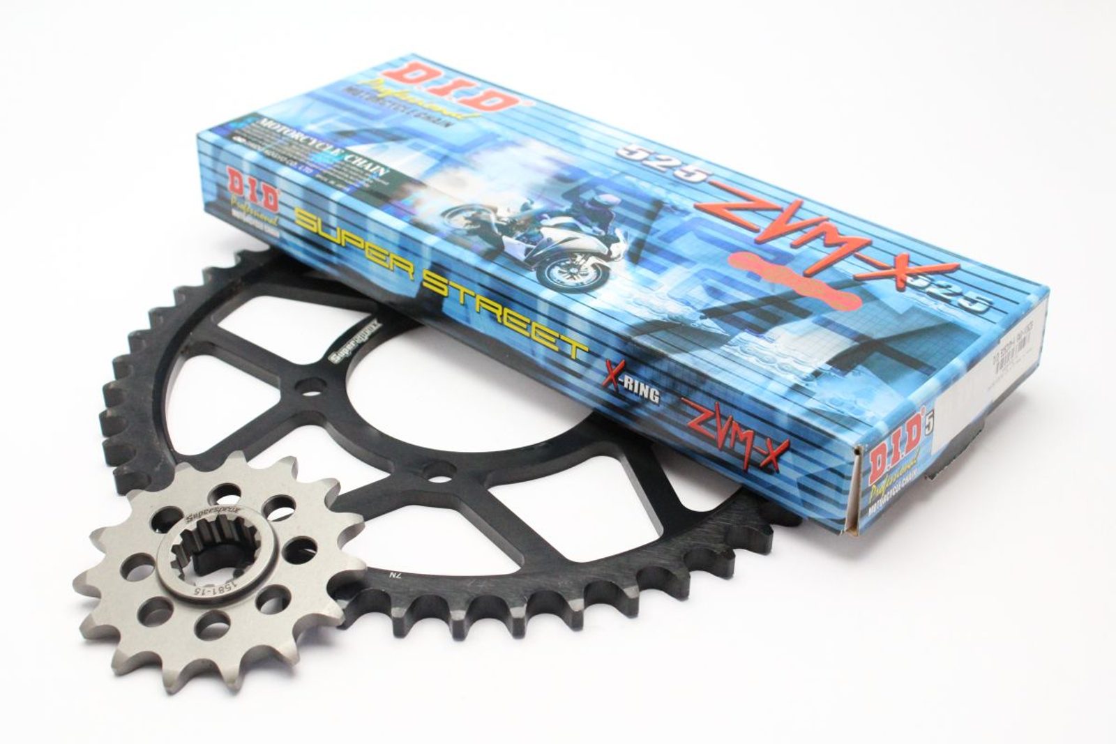 Řetězová sada - Řetěz D.I.D, řady ZVM-X ve zlaté barvě, těsněný X-Kroužkem. Ocelové kolečko a rozeta SUPERSPROX.