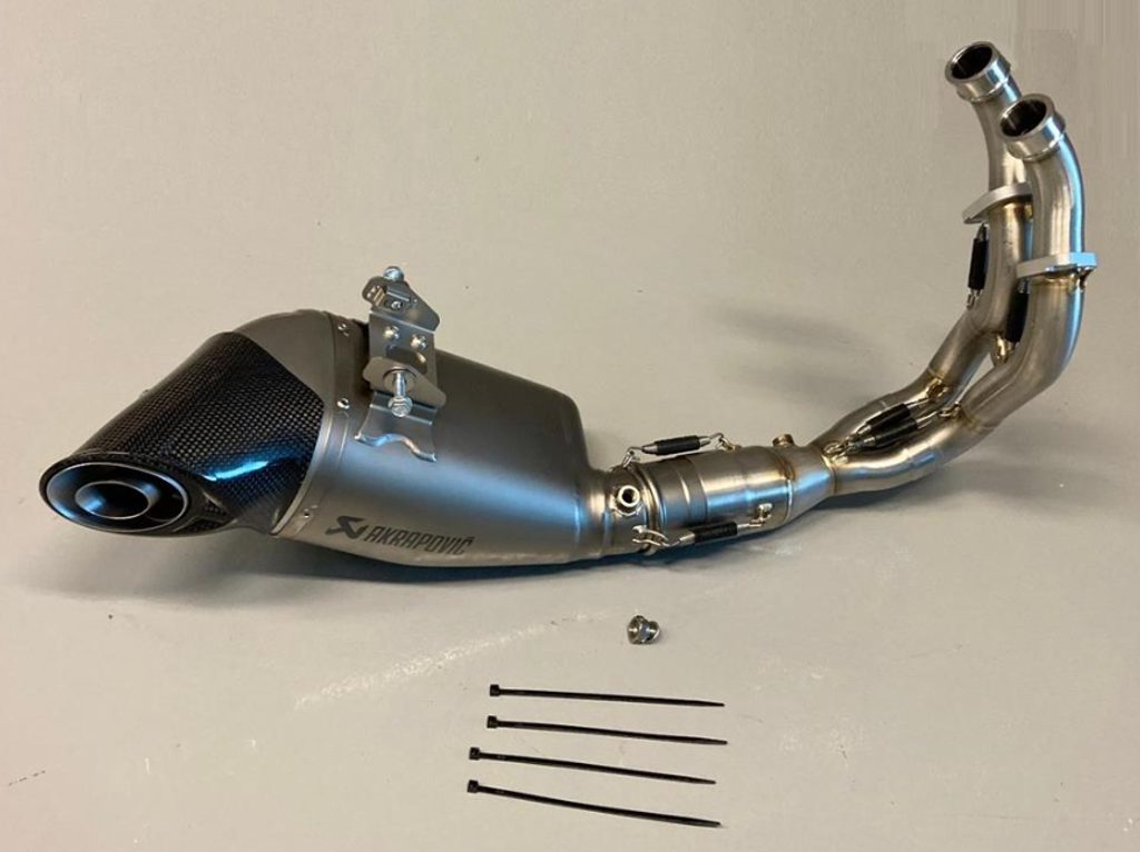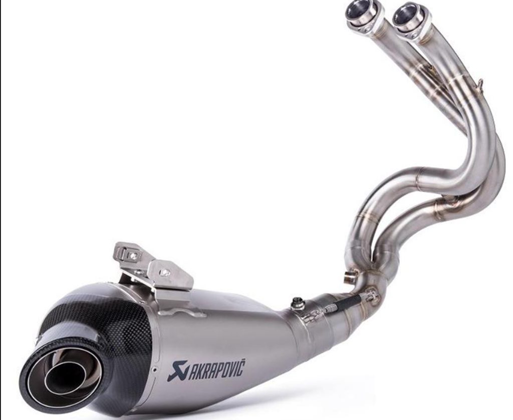 Kompletní titanový výfukový systém Akrapovič s katalyzátorem spolu s titanovým tlumičem výfuku. Tento systém je ve srovnání se sériovým výfukovým systémem asi o 2 kg lehčí a poskytuje čistý sportovní zvuk. Kombinace závodních materiálů, jako je titan pro vnější obal tlumiče výfuku a exit z uhlíkových vláken, dodávají tomuto výfukovému systému závodní nádech. Laserem vypálené logo výrobce.