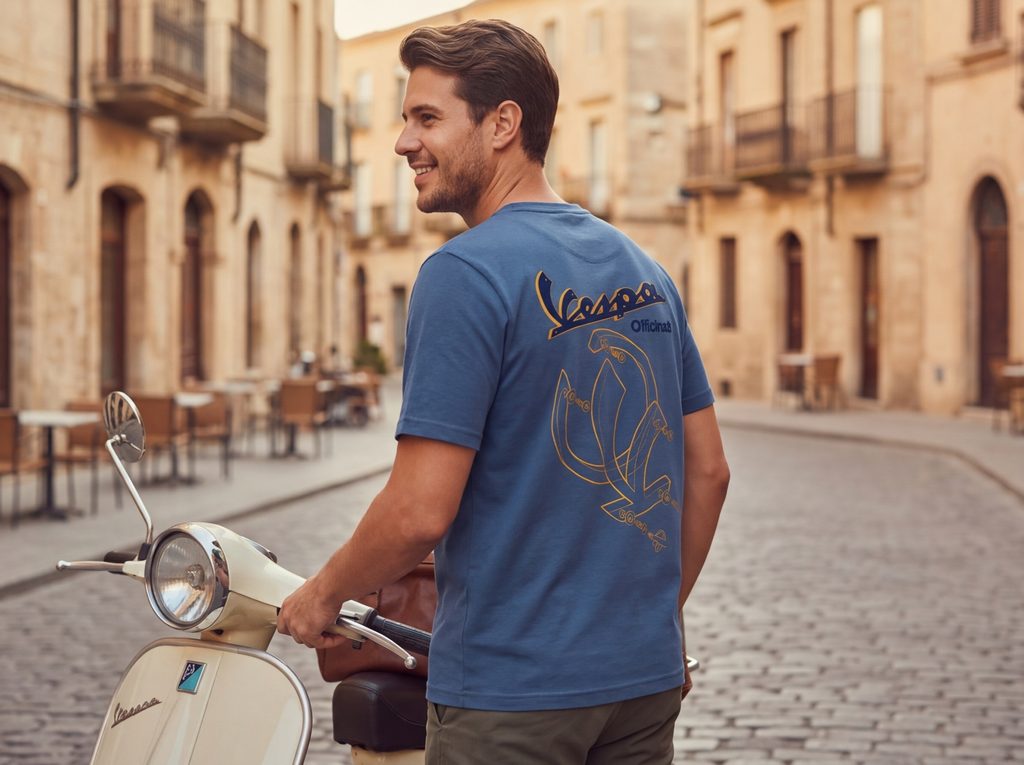 Tričko Vespa Officina 8 z prémiové 100% bavlny v elegantní modro-zlaté kombinaci je nezbytným doplňkem pro každého fanouška, který ocení kvalitu a italský styl.
