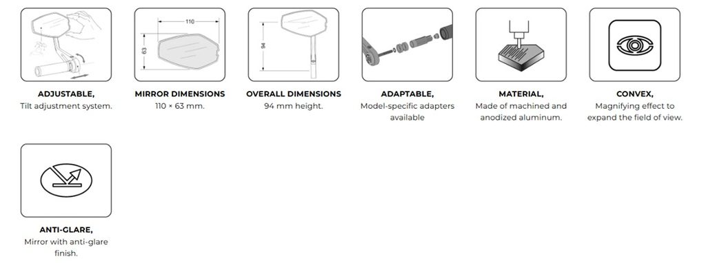 Zrcátko je vyrobeno z obráběného hliníku a opatřeno matně černou povrchovou úpravou, což zajišťuje vysokou pevnost a prémiové zpracování. Díky svému univerzálnímu designu jej lze použít na širokou škálu motocyklů, nejen na ty s klasickými řídítky.